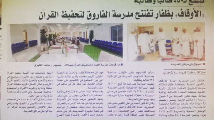 مدرسة الفاروق لتحفيظ القران الكريم وتدارسه وتعليمه تحت إشراف وزارة الأوقاف والشؤون الدينية بمحافظة ظفار ، افتتحت في 10 / 4 / 2018م تحت رعاية الدكتور أحمد الكعبي مدير عام المديرية العامة للأوقاف والشؤون الدينية بمحافظة ظفار بمدينة السعادة في صلالة بإدارة الفاضلة الشيخة نور بنت محمد آل إبراهيم .